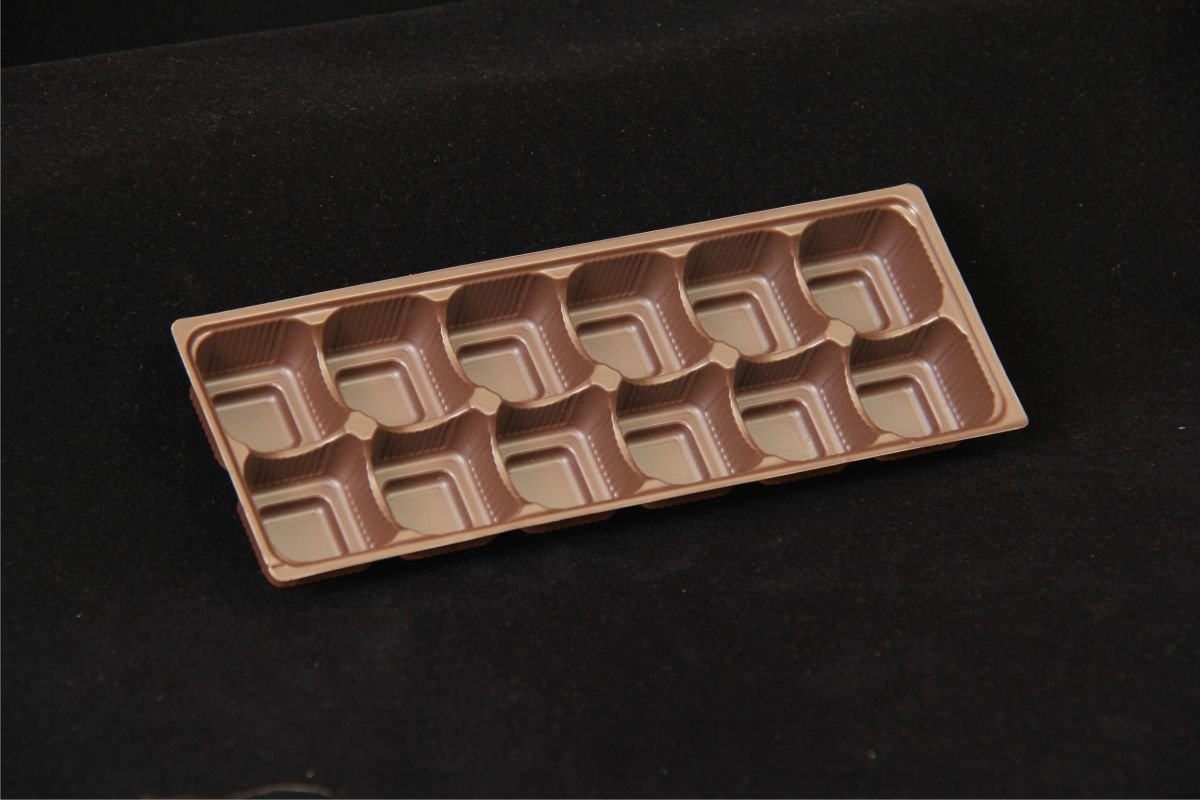 A brown matt-finish tray for packaging chocolates & bite-sized desserts.