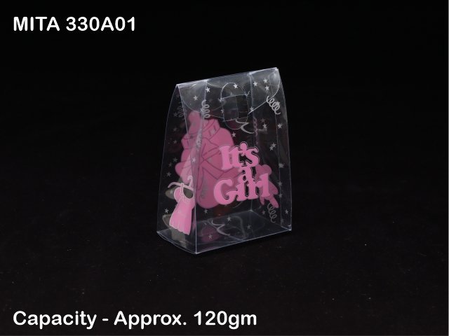 A chocolate packaging box with the text, “It’s a Girl”. This is a transparent plastic box.