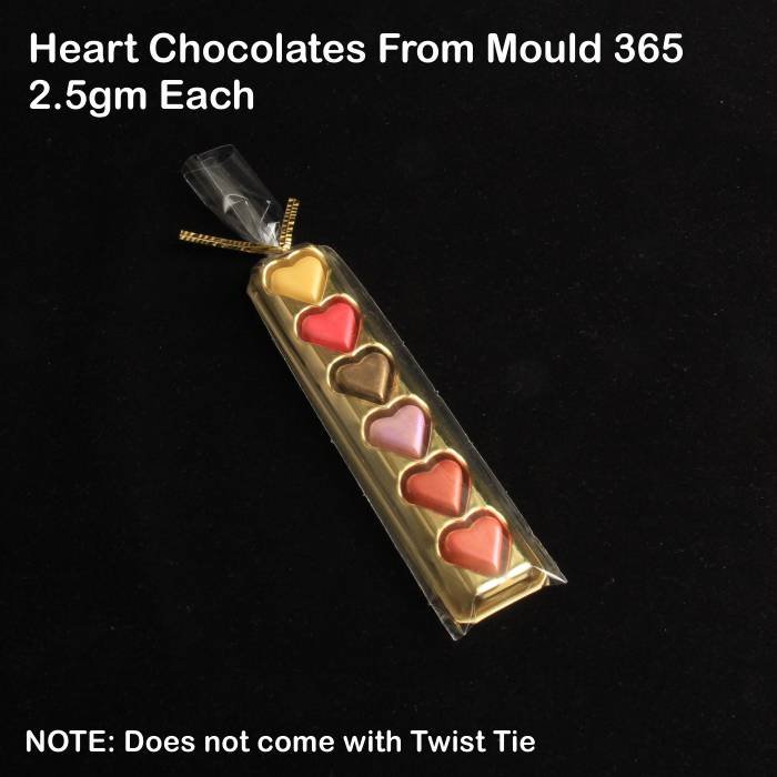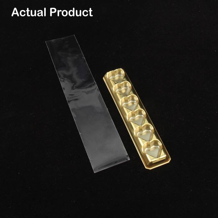A metallic golden packaging tray with 6 heart shaped cavities.