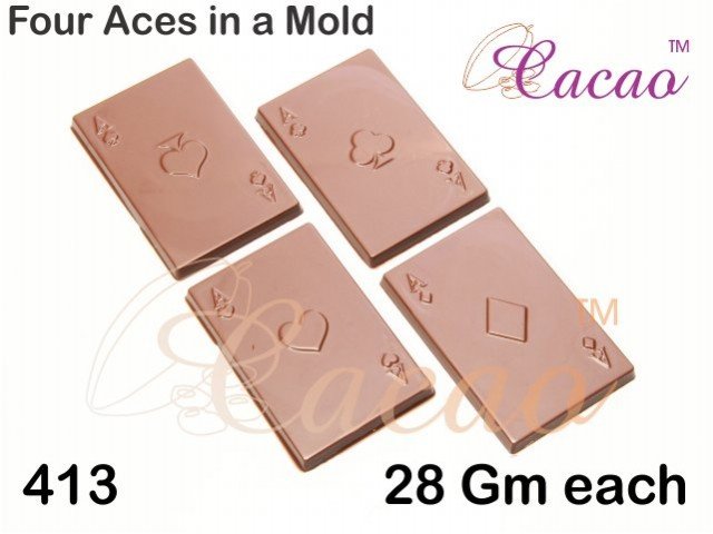 A professional chocolate mould that gives chocolates in the shape of 4 Aces seen in the standard card suit.Note: The 4-cavity greeting box can be used to pack these chocolates..