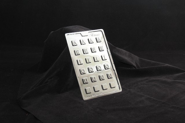 A professional chocolate mould for bite-sized vowel alphabets to be used with the “Choco@SMS” concept. .