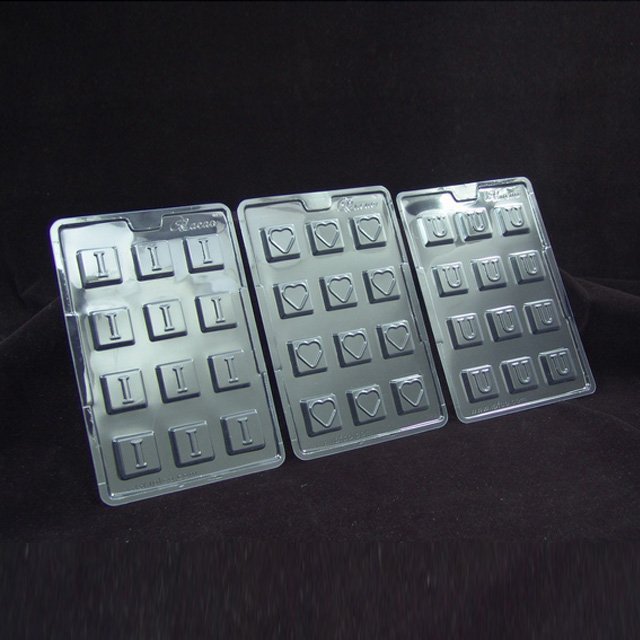 A 3 Mould set to make the “I love you” message in chocolate. These professional chocolate moulds can be packed in the “ILU Box” shown below.